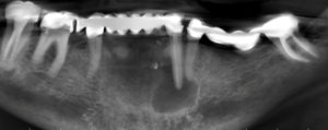 A 69-year-old woman presented to the dentist with intermittent pain she was experiencing over her left anterior mandible.