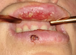 A 46-year-old man presented with painful lesions on his lips and fingers that had developed within the past 24 hours.